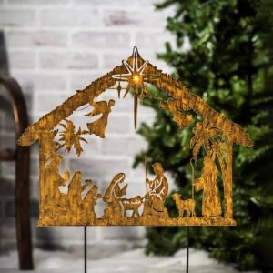 Celebrate the reason for the season this winter with this elegant nativity scene. Perfect for your holiday outdoor space and beautifully detailed, this metal garden stake depicts Mary, Joseph, and Baby Jesus in the manger as lambs, angels as wise men watch over. The classic scene is finished with a brightly shining sol