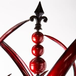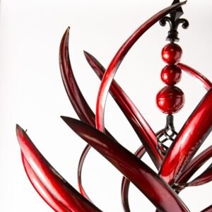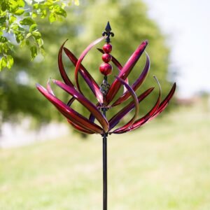 Our Crimson Lotus Wind Spinner stands more than 7 feet tall, making a bold statement in your yard. The unique design resembles a lotus flower, with curved and angled petals that rotate around the stake. A detailed center piece with final, small spheres and scrollwork adds artistic interest to this stunning garden art. The rich crimson, high gloss finish looks great with green shrubs and all of your blooms. Sturdy metal with a sectional pole, ground stakes and all-weather finish.