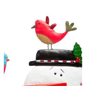 Our charming metal snowman statue has attracted seven quirky birds in a charming display destined to delight. Brightly painted colors and wonderful details, such as a hat with holly trim, make him stand out in your yard or garden.
