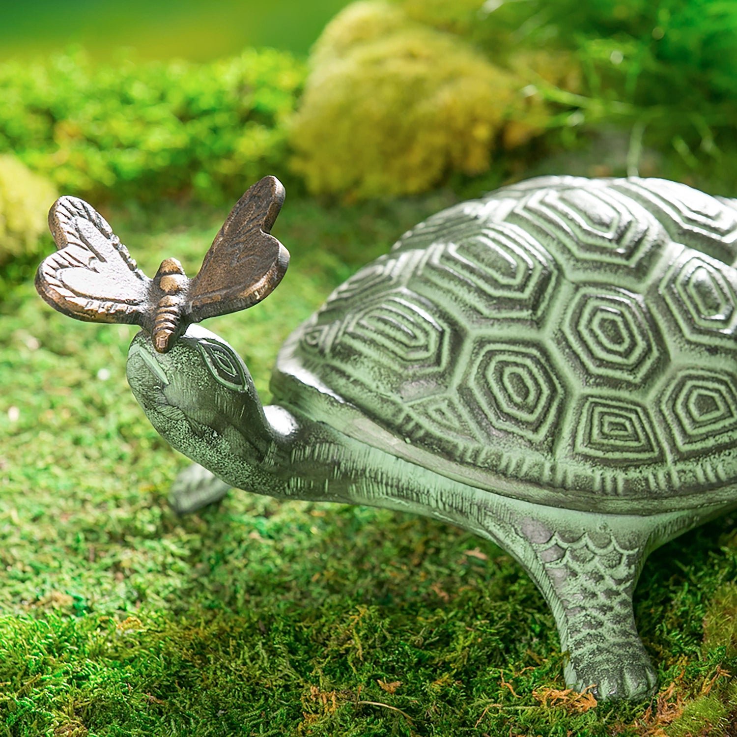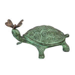 Add a dash of charm to your garden with this whimsical Turtle and Butterfly Verdigris Metal Garden Statuary. The distressed, green finish on the bronze statue gives it a rustic look that adds to its vintage feel. Perfect for any outdoor space that needs an extra touch of decor, this statuary adds a sweet statement that is sure to bring smiles. The outdoor-safe turtle is made with weather-resistant material that ensures it won’t fade for seasons to come.