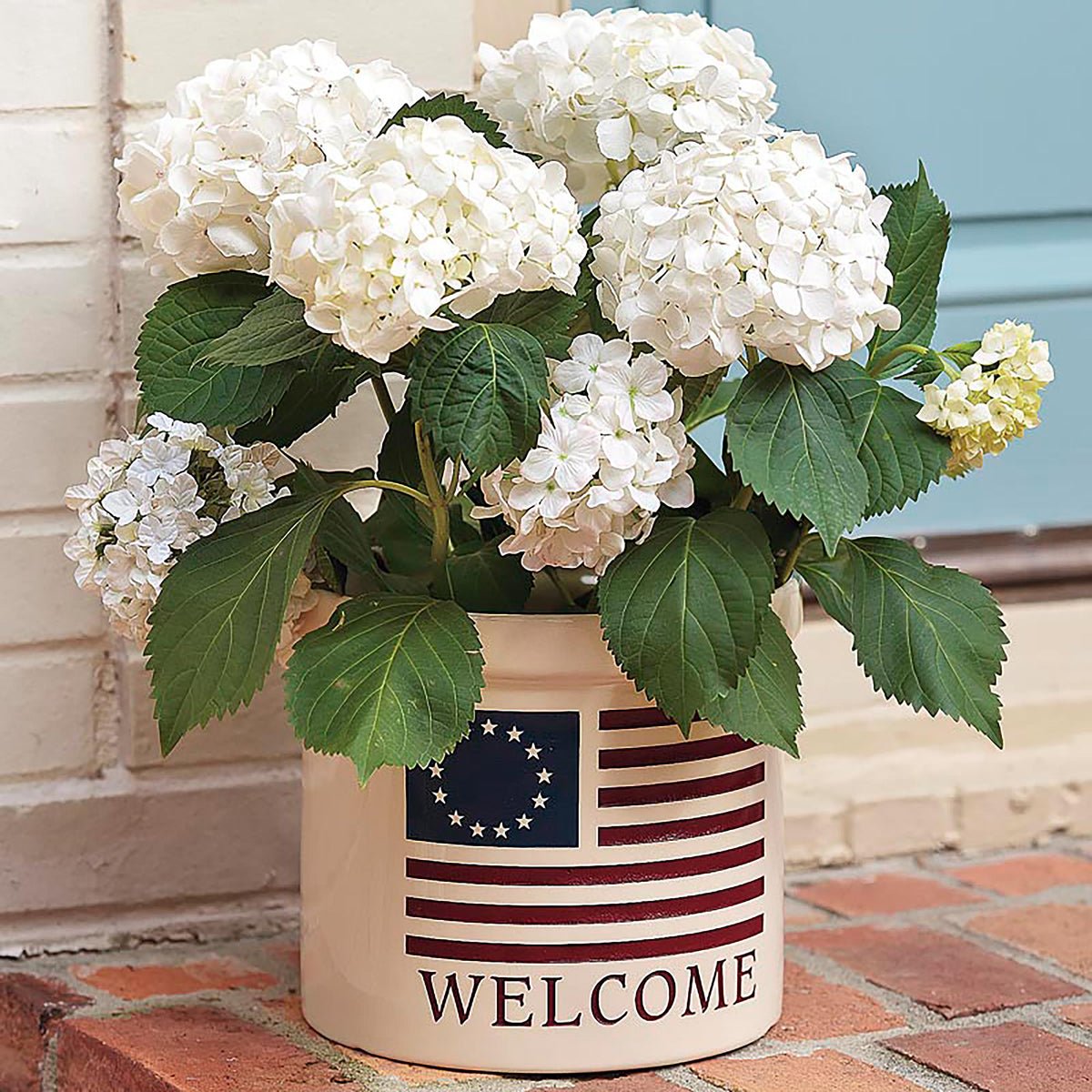 Featuring the American flag with the 13 original colonies, our USA-Made Americana Welcome Stoneware Crock showcases your pride—and your plants!